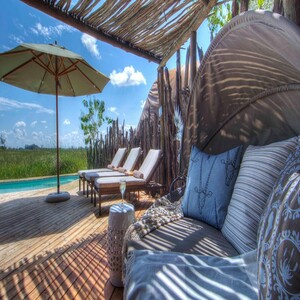 Okuti draws its influence from the Maunachira River which flows in front of the camp, with its abundant birdlife, fish and sandy river banks, it remains an oasis of serenity and peacefulness. Okuti is built amidst the wilderness of one of Botswana’s prime game viewing regions, Moremi Game Reserve.